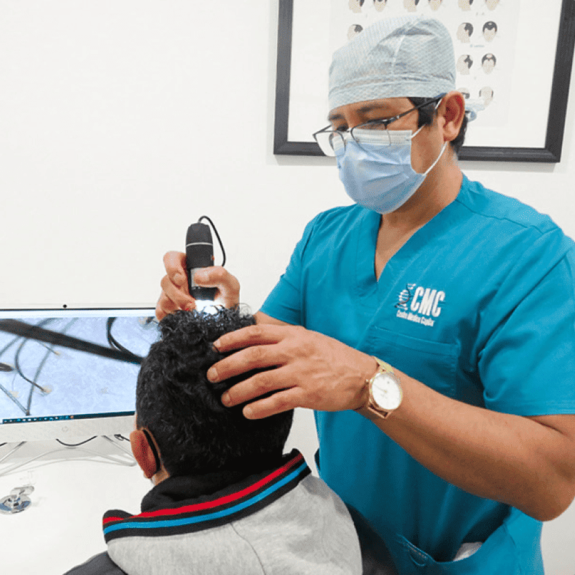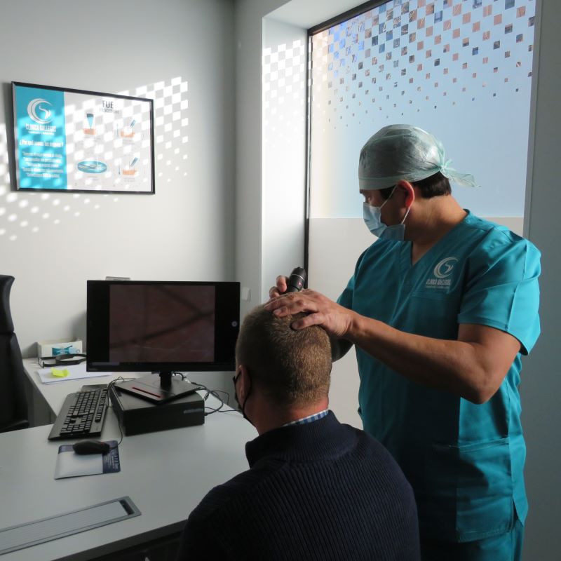Durante la valoración médica gratuita examinamos tu cuero cabelludo con un microscopio capilar (tricoscopio).